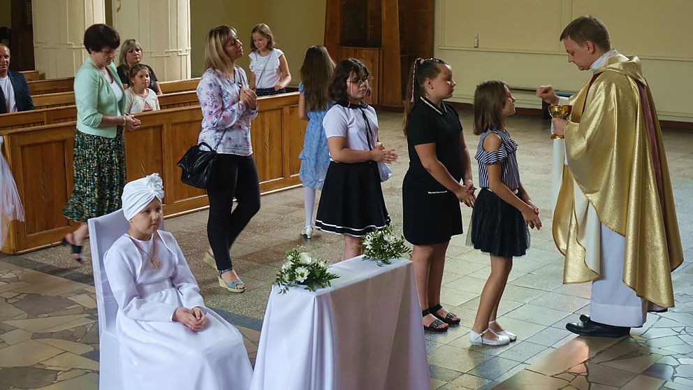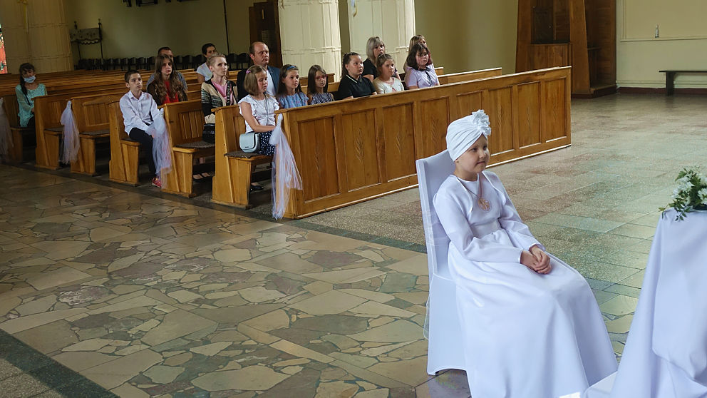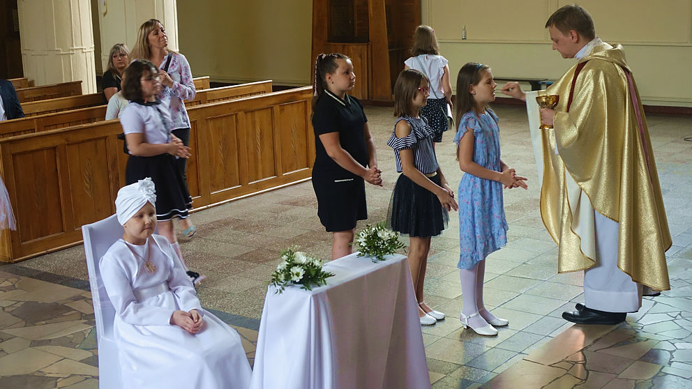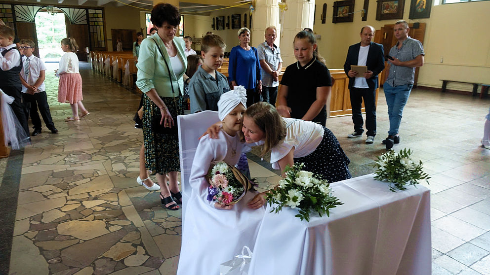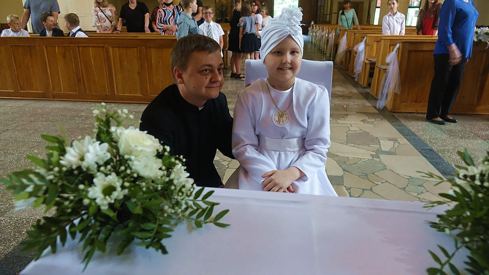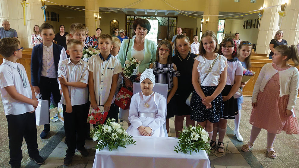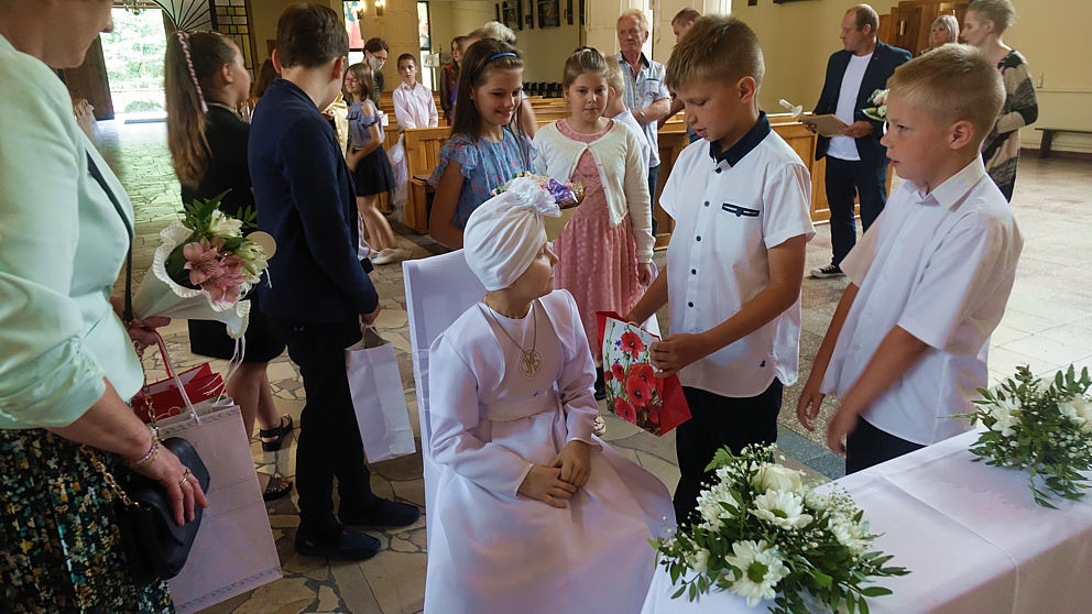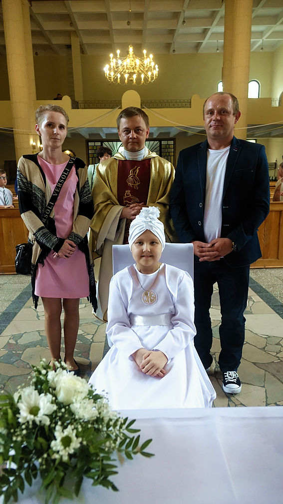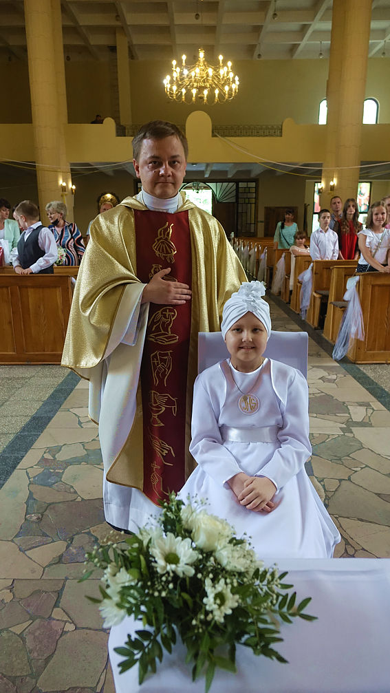W sobotnie popołudnie w naszej parafii odbyła się uroczystość komunijna Julii Mularczyk. Z powodów zdrowotnych Julia nie mogła uczestniczyć w I Komunii św. razem ze swoją klasą. Jednak jej koledzy, koleżanki i pani wychowawczyni byli obecni na tej niezwykłej Mszy św. Ks. Arkadiusz kilkakrotnie podkreślił pogodę ducha Bohaterki Dnia i jej uśmiech za każdym razem, kiedy ktoś na nią patrzył.