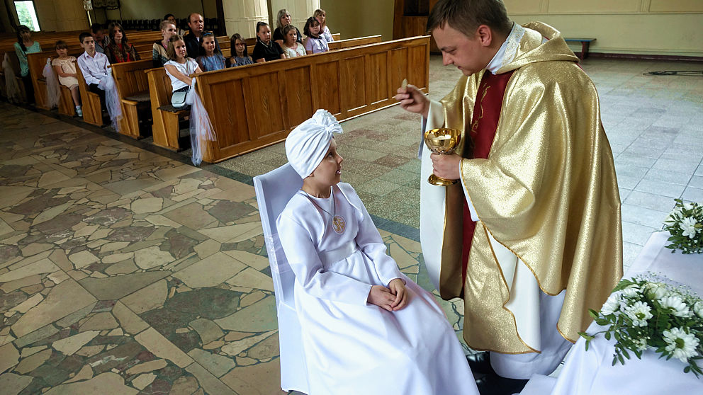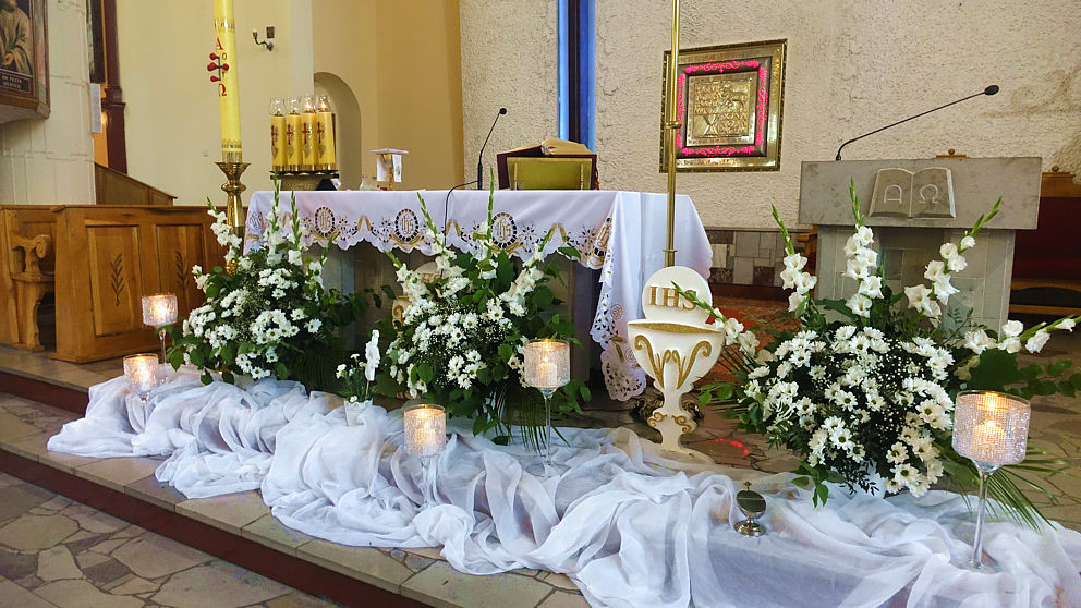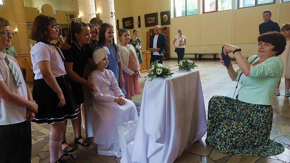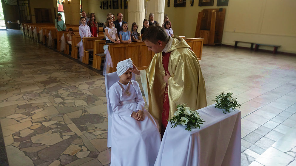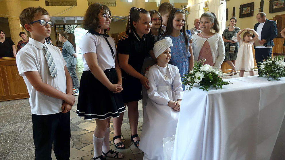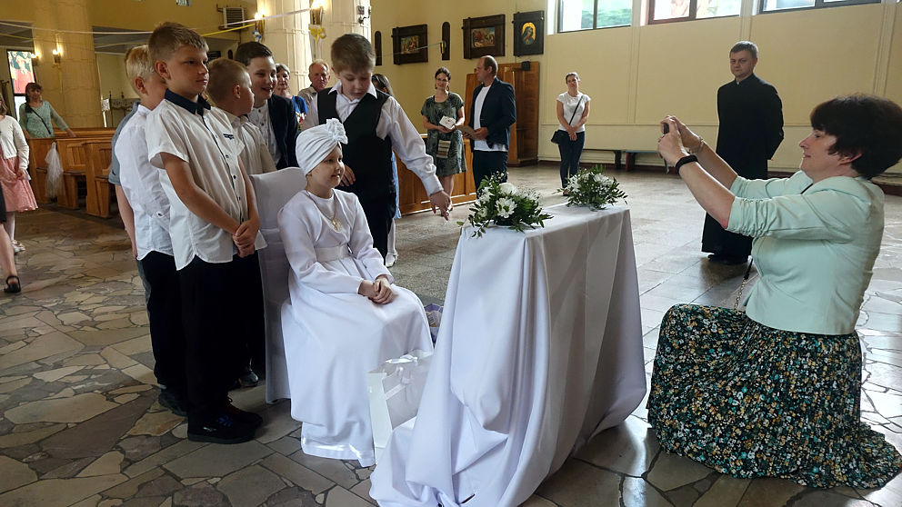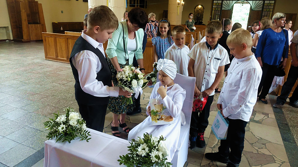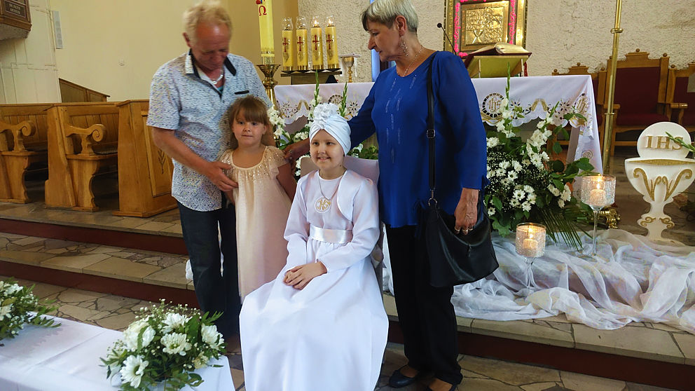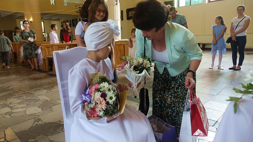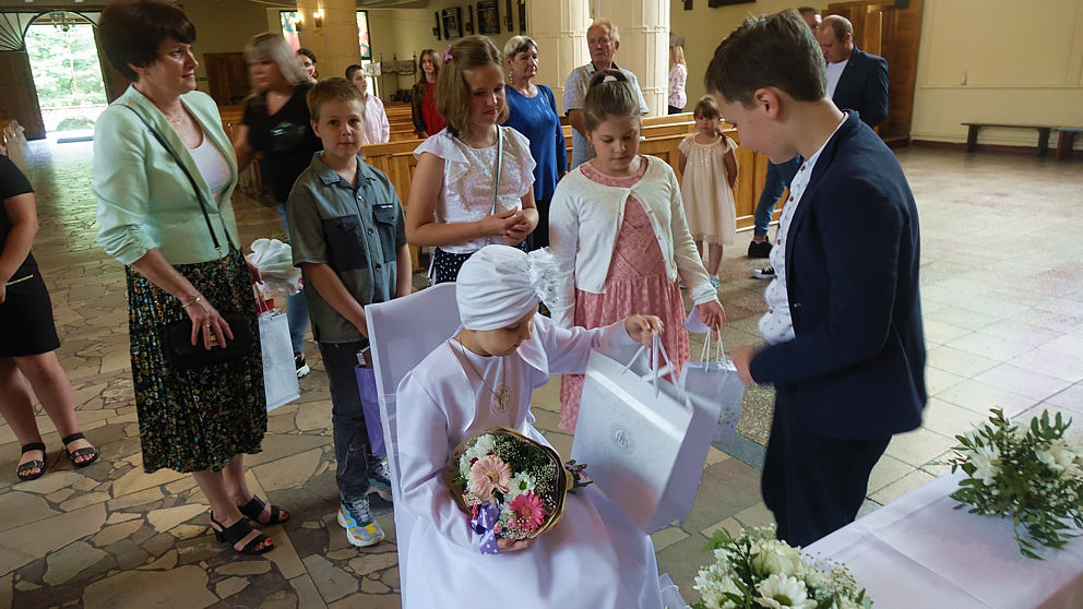 W sobotnie popołudnie w naszej parafii odbyła się uroczystość komunijna Julii Mularczyk. Z powodów zdrowotnych Julia nie mogła uczestniczyć w I Komunii św. razem ze swoją klasą. Jednak jej koledzy, koleżanki i pani wychowawczyni byli obecni na tej niezwykłej Mszy św. Ks. Arkadiusz kilkakrotnie podkreślił pogodę ducha Bohaterki Dnia i jej uśmiech za każdym razem, kiedy ktoś na nią patrzył.