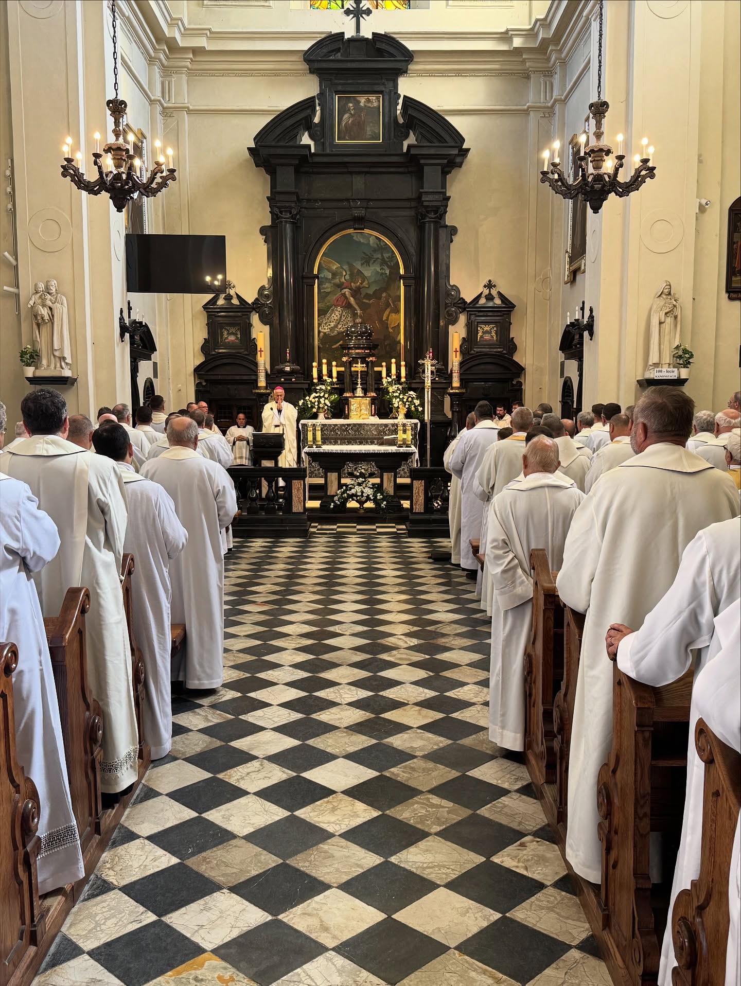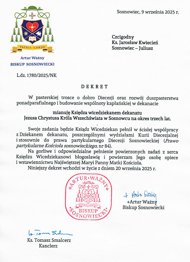 Dziś, w trzecią sobotę września, duchowieństwo Diecezji Sosnowieckiej pielgrzymowało do sanktuarium Matki Bożej Szkaplerznej w Czernej. To coroczne spotkanie modlitwy, braterstwa i zawierzenia, które od lat gromadzi kapłanów naszej diecezji przy grobie św. Rafała Kalinowskiego - patrona diecezji sosnowieckiej. Na zakończenie bp Artur Wręczył nomnacje dla dziekanów, wicedziekanów i ojców duchownych poszczególnych dekanatów diecezji.