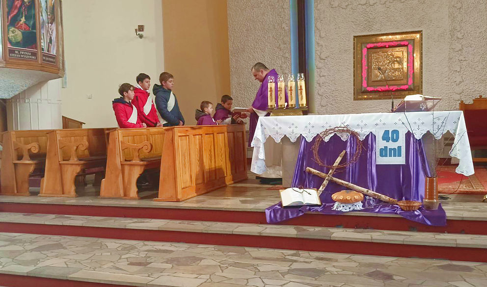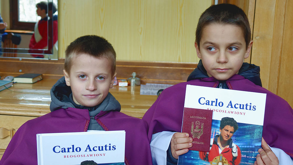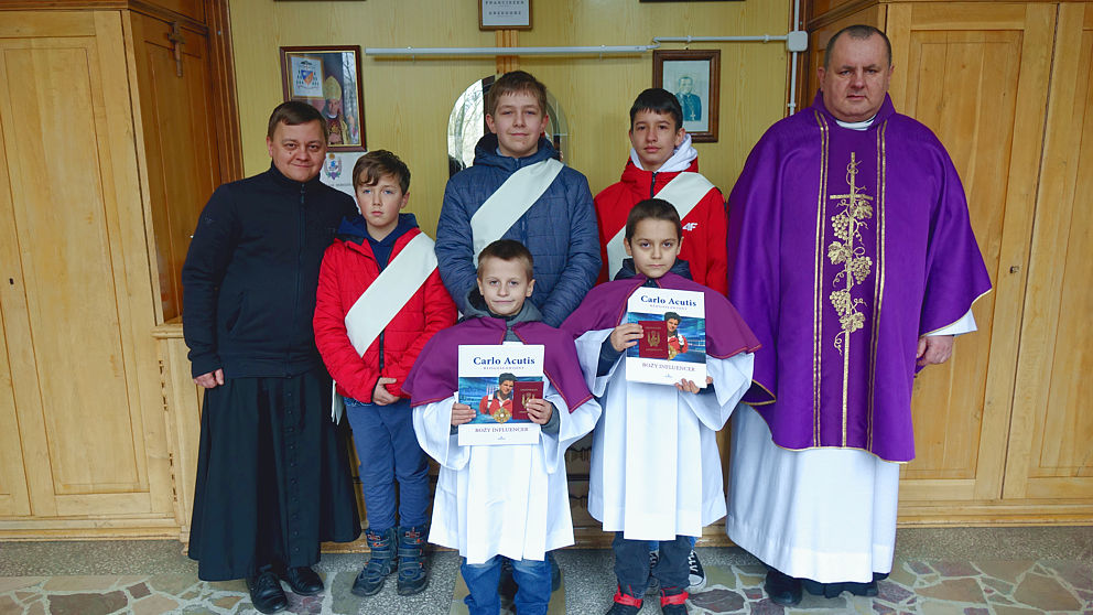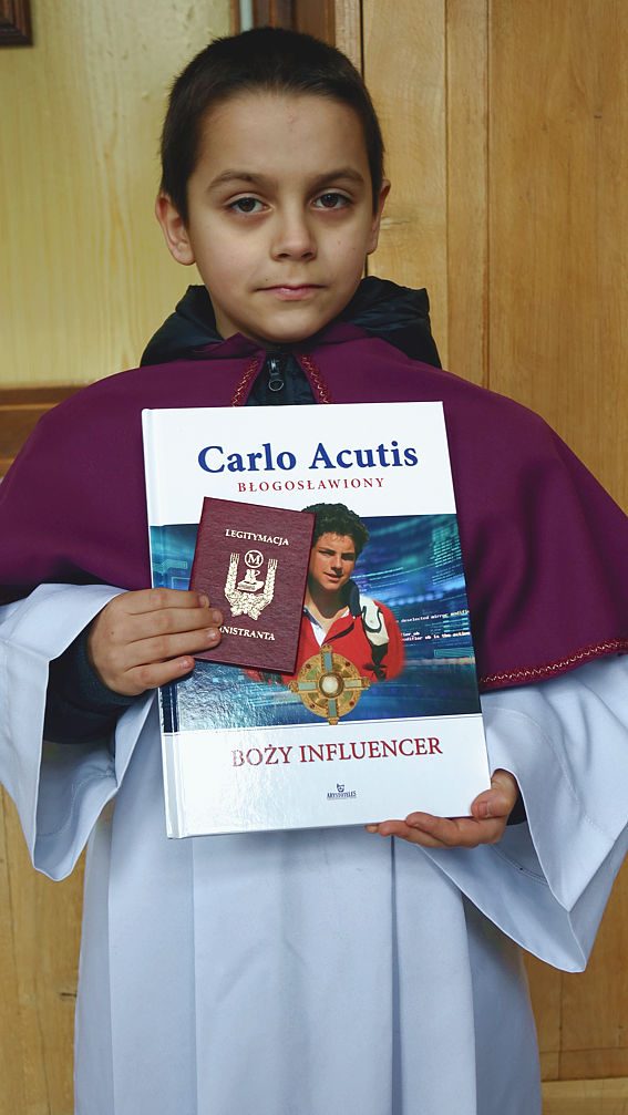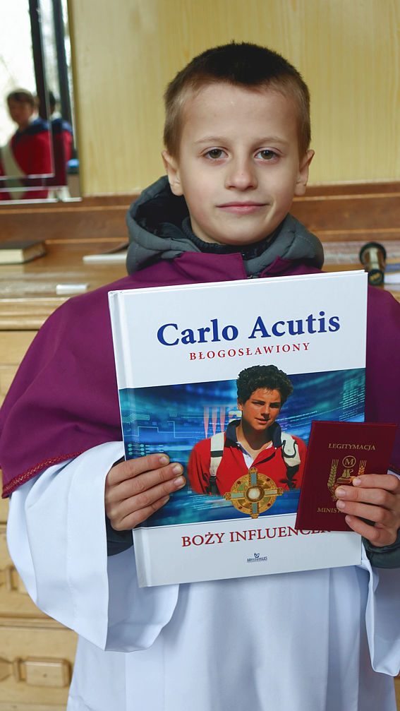 W naszej parafii 26 lutego miał miejsce obrzęd przyjęcia do grona ministrantów dwóch nowych członków. Oliwier i Alan przez wiele miesięcy przygotowywali się do tego wydarzenia pod kierunkiem ks. Arkadiusza. Przed księdzem proboszczem Jarosławem i całą parafią złożyli uroczyste ślubowanie. Po raz pierwszy założyli też komżę czyli strój ministranta. Otrzymali też legitymację potwierdzającą przynależność do Służby Liturgicznej Ołtarza. Na pamiątkę otrzymali również albumy poświęcone błogosławionemu Carlo Acutisowi. który zmarł w 2006 roku, mając 15 lat. Chętnie wykorzystywał internet do ewangelizacji i propagowania wiary, stąd dziś mówi się o nim jako o patronie internetu. Jak widać na zdjęciach, kolejni kandydaci, zresztą nieco starsi (i wyżsi) przygotowują się do złożenia przyrzeczenia ministranckiego. Życzymy powodzenia, cierpliwości i codziennego zbliżania się do Chrystusa.