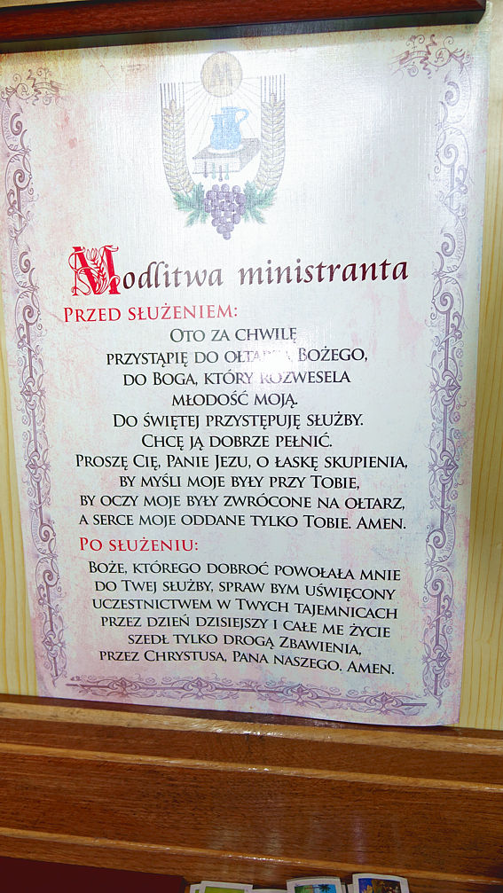 „Ja ... dziękując Chrystusowi Panu, za łaskę powołania ministranckiego, przyrzekam święte czynności ministranta wypełniać pobożnie, gorliwie i radośnie, na chwałę Bożą i dla dobra wspólnoty parafialnej. Święty Stanisławie Kostko módl się za nami. Amen”.