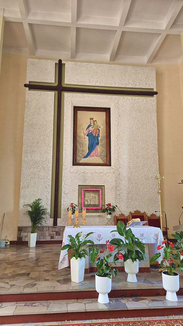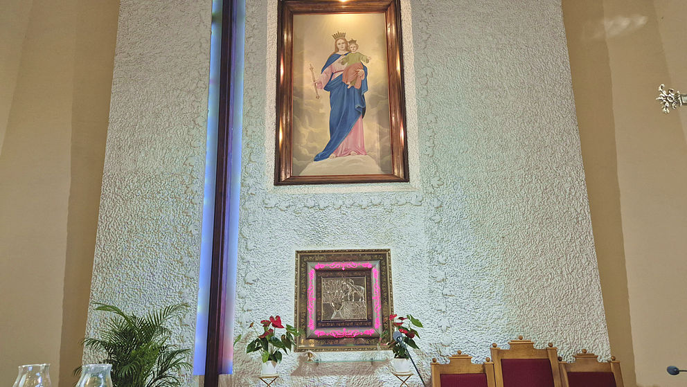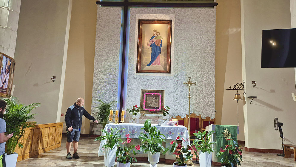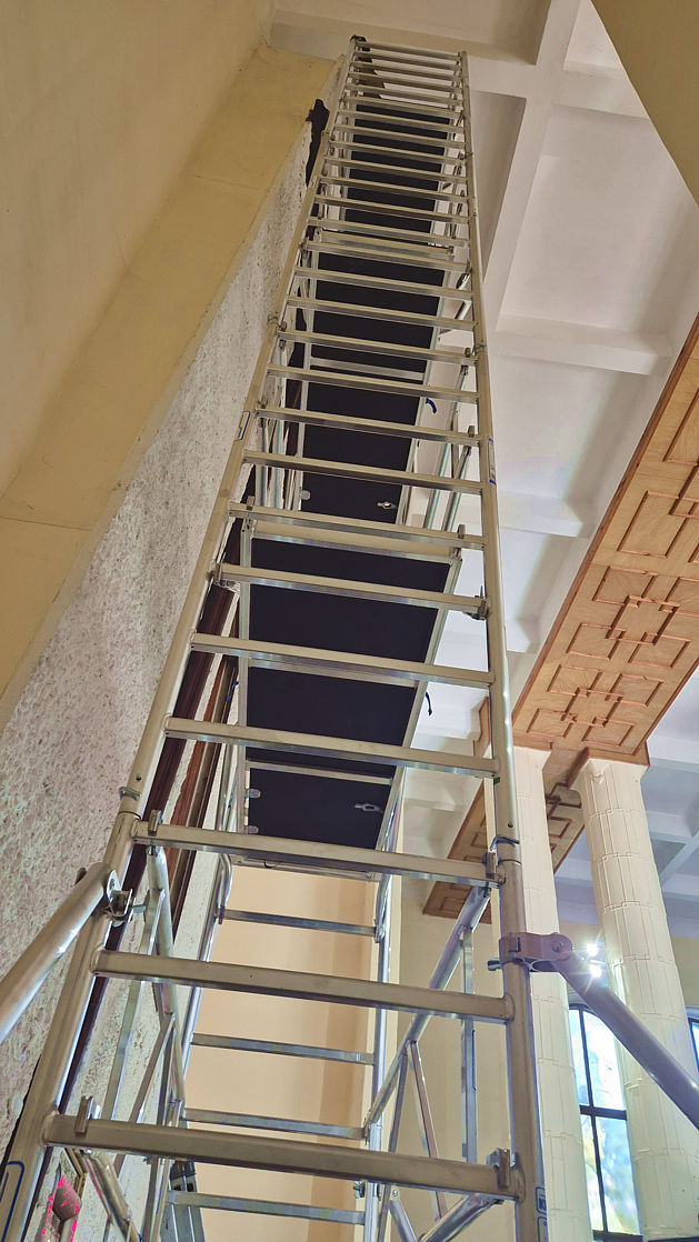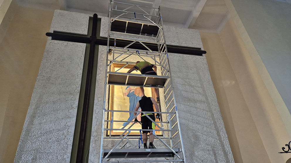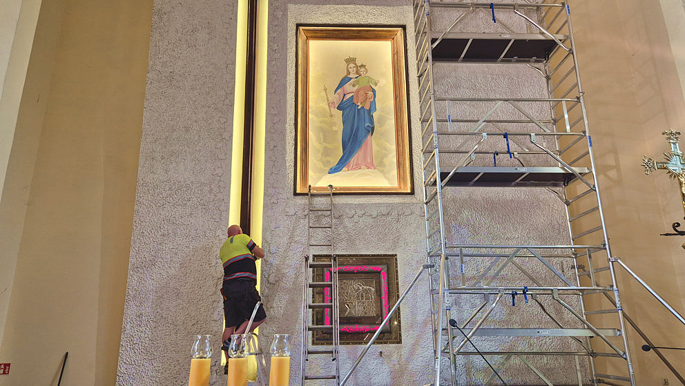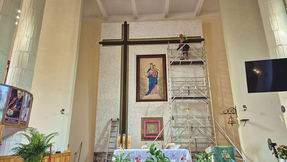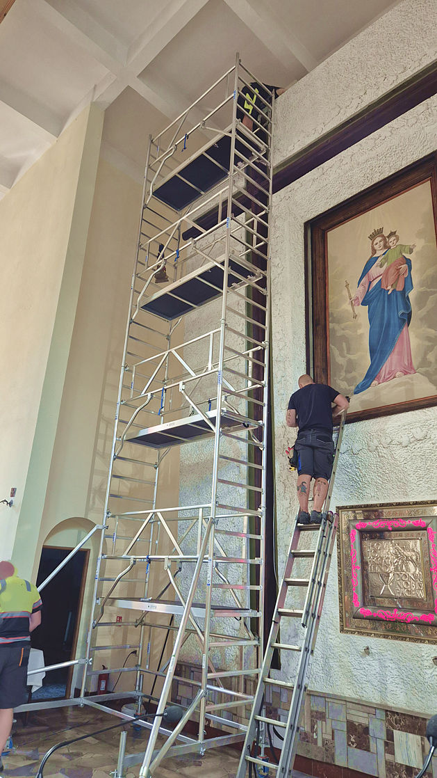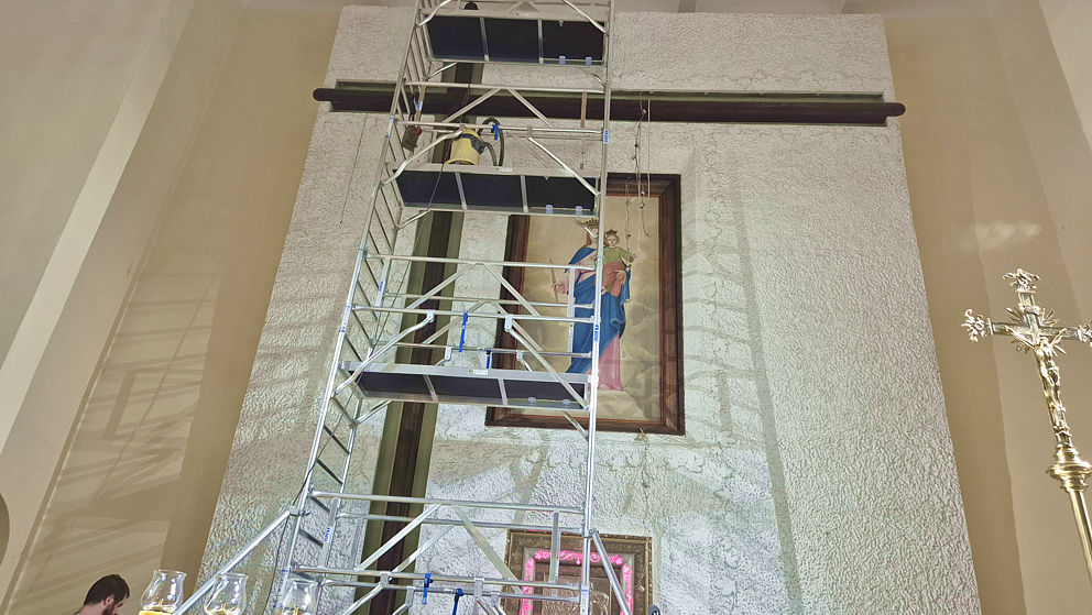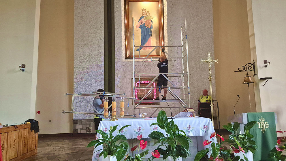 Rozpoczęła się wymiana oświetlenia wokół obrazu Matki Bożej Wspomożenia Wiernych i krzyża w ołtarzu głównym w naszej parafii. Jako że obraz i krzyż są bardzo wysokie, firma z Jaworzna postawiła kilkumetrowe rusztowanie. Dzięki niemu można usunąć oprawki starych lamp, zamontować aluminiowe listwy, do których zostanie przytwierdzone oświetlenie ledowe.