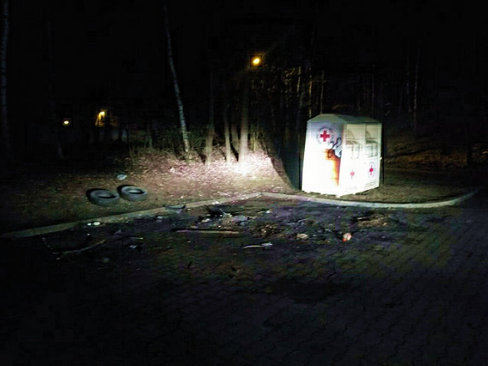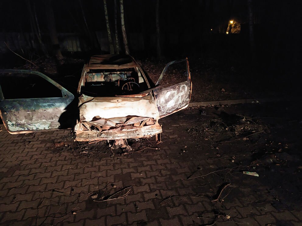 Przesyłam fotografie z wczoraj - wrak spalonego auta (na parkingu obok naszego cmentarza parafialnego). A także z dziś wieczorem- już uprzątnięty. Na terenie pozostały jeszcze z tego, co widzę, resztki popiołu.