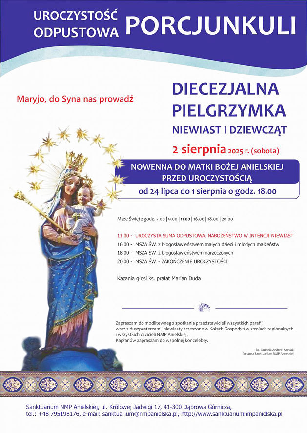 Kustosz Sanktuarium Matki Bożej Anielskiej w Dąbrowie Górniczej serdecznie zaprasza do udziału w uroczystości odpustowej oraz Diecezjalnej Pielgrzymce Kobiet i Dziewcząt, która odbędzie się 2 sierpnia 2025 r. (sobota). Hasłem tegorocznej uroczystości są słowa „Maryjo, do Syna nas prowadź”.