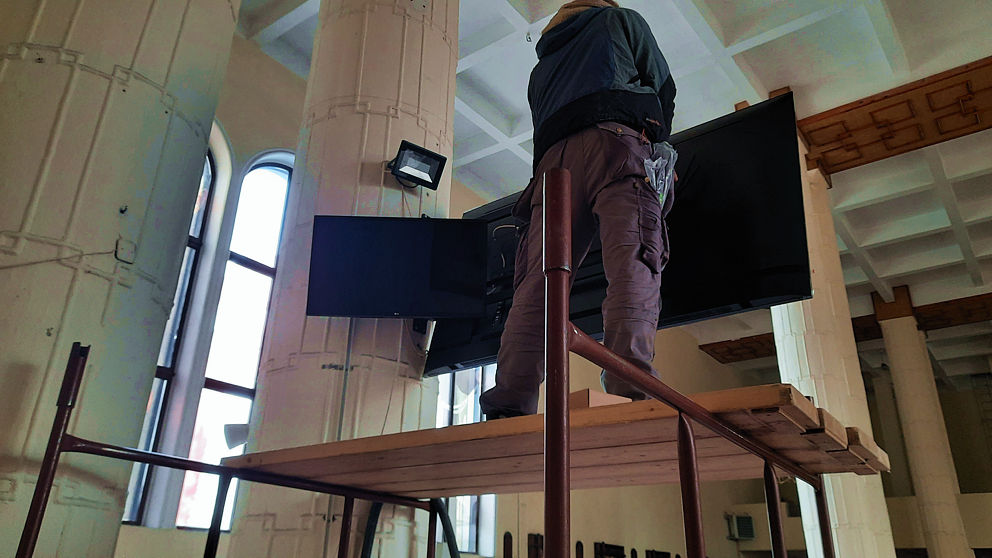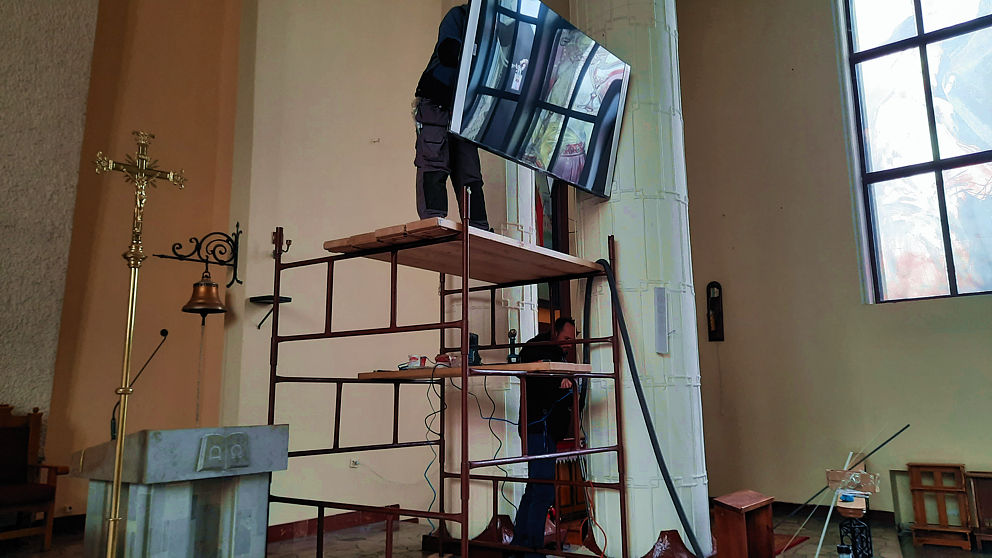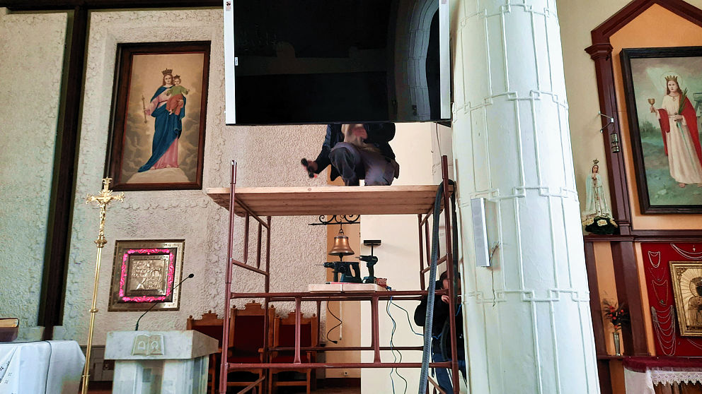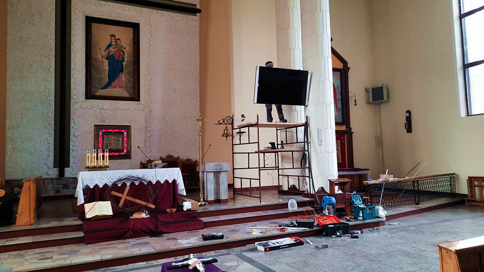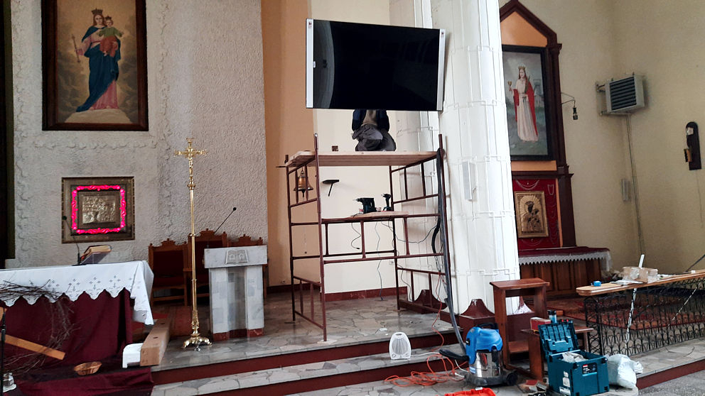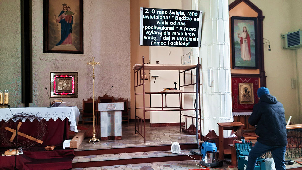 Przez cały dzień przedstawiciele firmy z Krakowa montowali nowy system multimedialny w naszym kościele. Dzięki niemu teksty pieśni będą lepiej widoczne. Dodatkowo czasami będzie można wyświetlić np. zdjęcia ilustracyjne do kazania, a nawet filmik. System ma dźwięczną nazwę Serafin. Jak będzie trzeba, to Serafin nawet zaśpiewa…