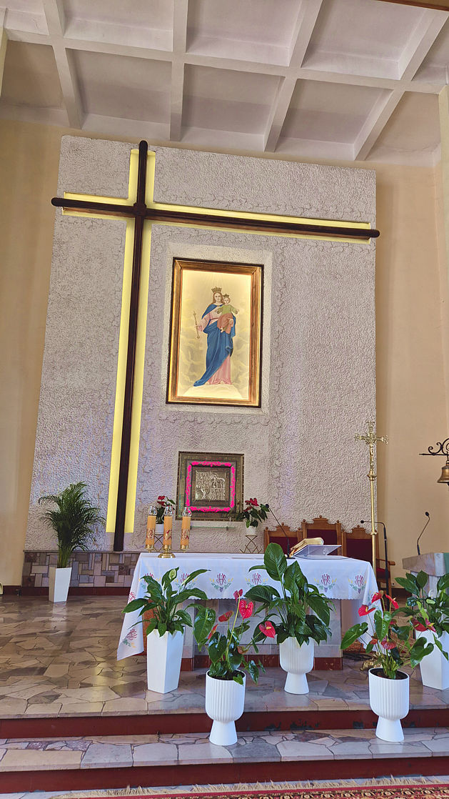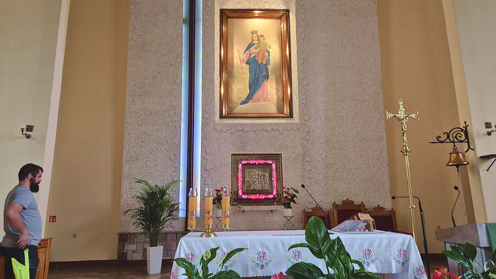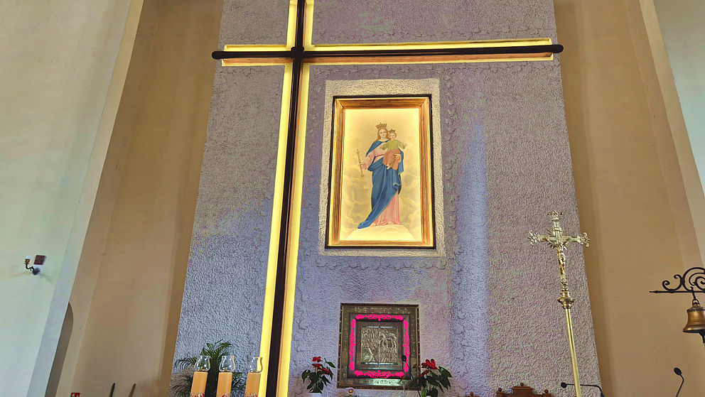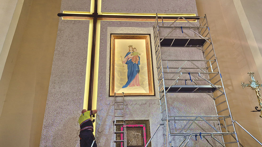Rozpoczęła się wymiana oświetlenia wokół obrazu Matki Bożej Wspomożenia Wiernych i krzyża w ołtarzu głównym w naszej parafii. Jako że obraz i krzyż są bardzo wysokie, firma z Jaworzna postawiła kilkumetrowe rusztowanie. Dzięki niemu można usunąć oprawki starych lamp, zamontować aluminiowe listwy, do których zostanie przytwierdzone oświetlenie ledowe.